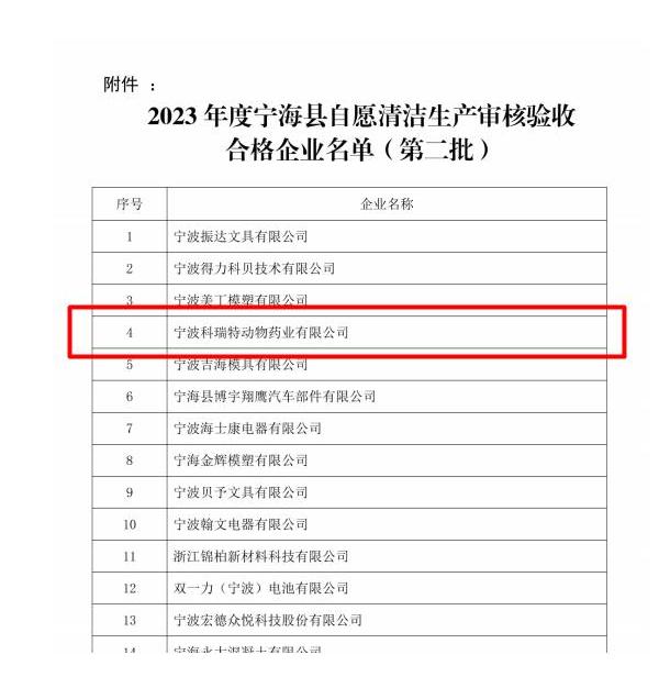 寧波科瑞特動(dòng)物藥業(yè)有限公司成功通過2023年度寧??h清潔生產(chǎn)審核驗(yàn)收!