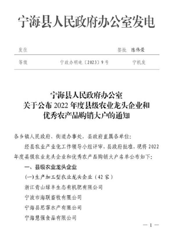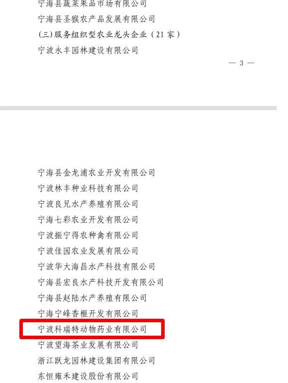 近日,經(jīng)縣農(nóng)業(yè)產(chǎn)業(yè)化工作領(lǐng)導(dǎo)小組評(píng)審,縣政府批準(zhǔn),寧波科瑞特動(dòng)物藥業(yè)有限公司榮獲“2022年度縣級(jí)農(nóng)業(yè)龍頭企業(yè)”稱號(hào)。