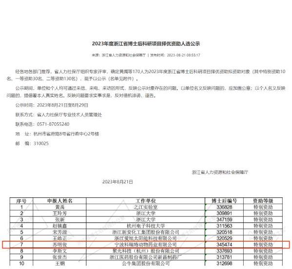 熱烈祝賀寧波科瑞特動物藥業(yè)有限公司博士后工作站與浙江農(nóng)林大學(xué)聯(lián)合培養(yǎng)的博士蘇明俊榮獲本次評審特別資助。