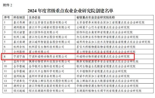 近日,根據(jù)《浙江省科學(xué)技術(shù)廳關(guān)于進(jìn)一步加強農(nóng)業(yè)科技創(chuàng)新載體建設(shè)工作的通知》,經(jīng)自愿申報、設(shè)區(qū)市推薦、形式審查、實地考察、專家評審、網(wǎng)上公示等環(huán)節(jié),寧波科瑞特動物藥業(yè)有限公司成功列入“2024年度省級重點農(nóng)業(yè)企業(yè)研究院創(chuàng)建名單”。