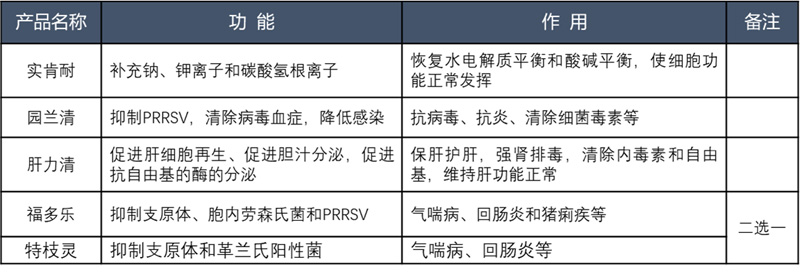 藍(lán)耳陰性場(chǎng):實(shí)肯耐1kg+肝力清1kg+特枝靈200g或福多樂(lè)800g